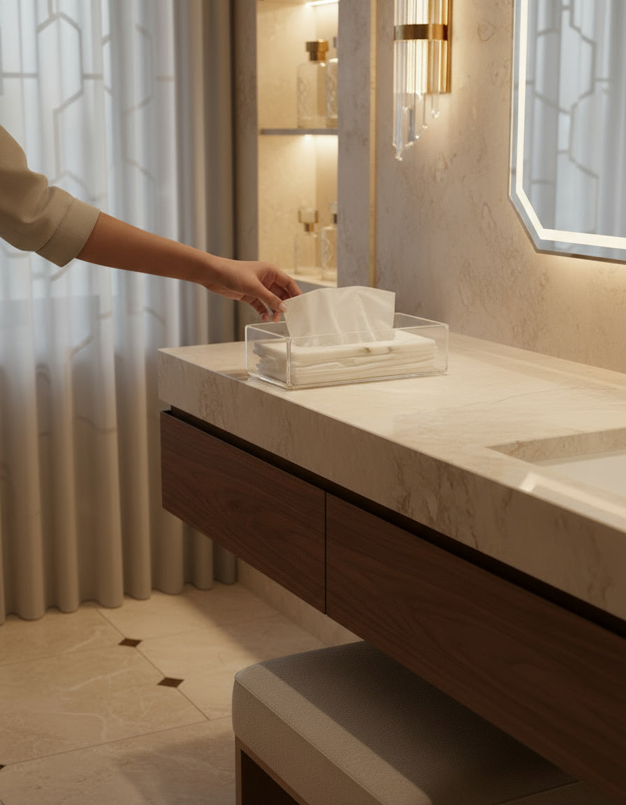 Perfectly sized for standard tissue boxes, this piece is ideal for bathrooms, bedrooms, guest areas, or any space that needs a refined touch. The marble lid adds contrast and texture, while the clear base keeps things light, modern, and airy.