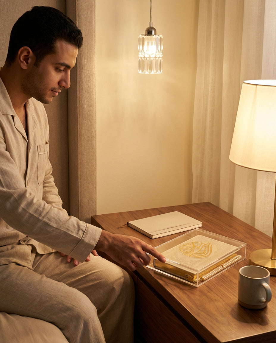 Choose from meaningful engravings such as “القرآن الكريم” (The Holy Qur’an), “رمضان كريم” (Blessed Ramadan), or personalize with a loved one’s name for an unforgettable keepsake. Available empty or with a Qur’an and Sebha, this versatile piece becomes a centerpiece for Ramadan, Eid, or everyday devotion. With its clear form and golden detail, the Qur’an Calligraphy Box enriches prayer spaces while preserving the sanctity of the book it holds.