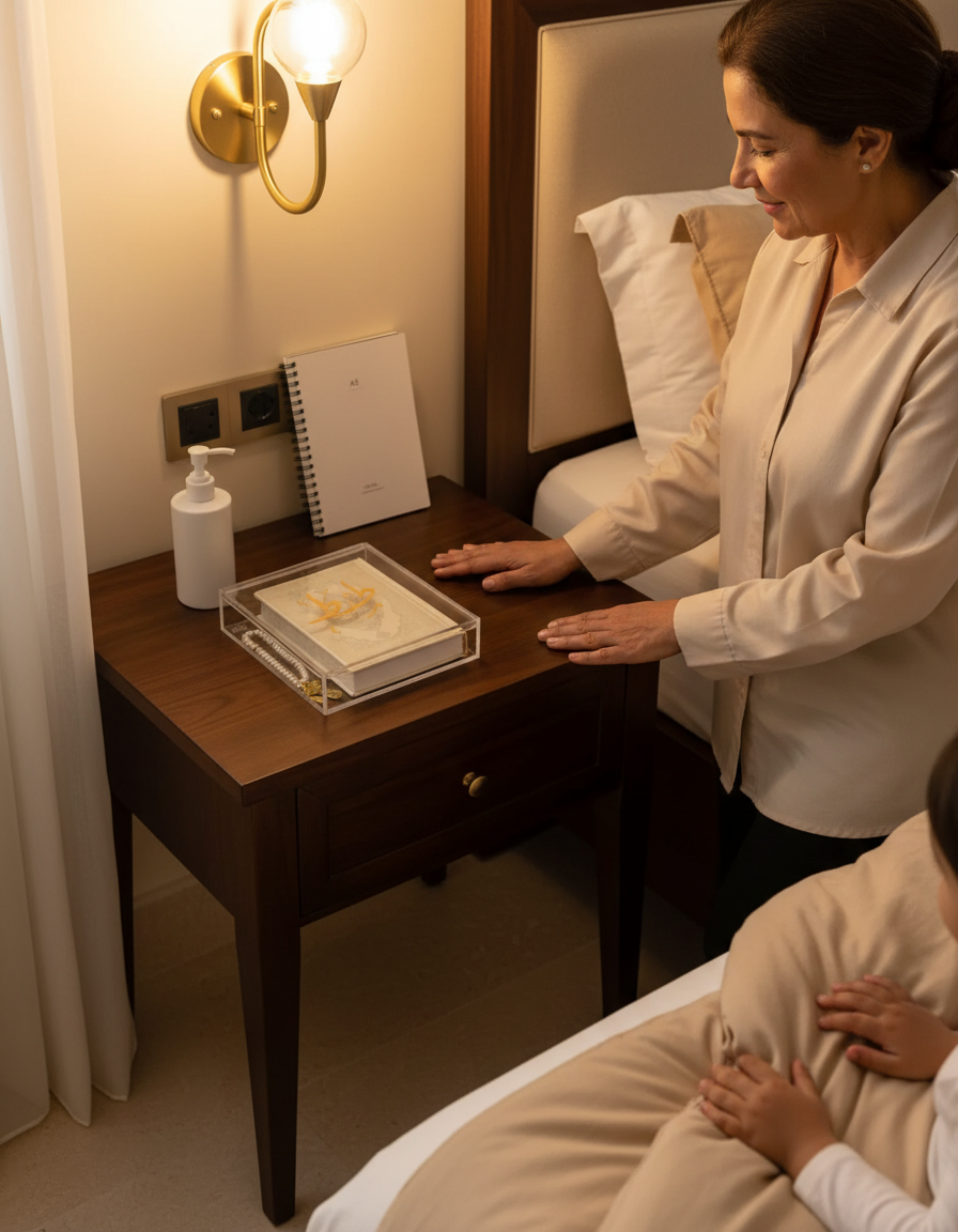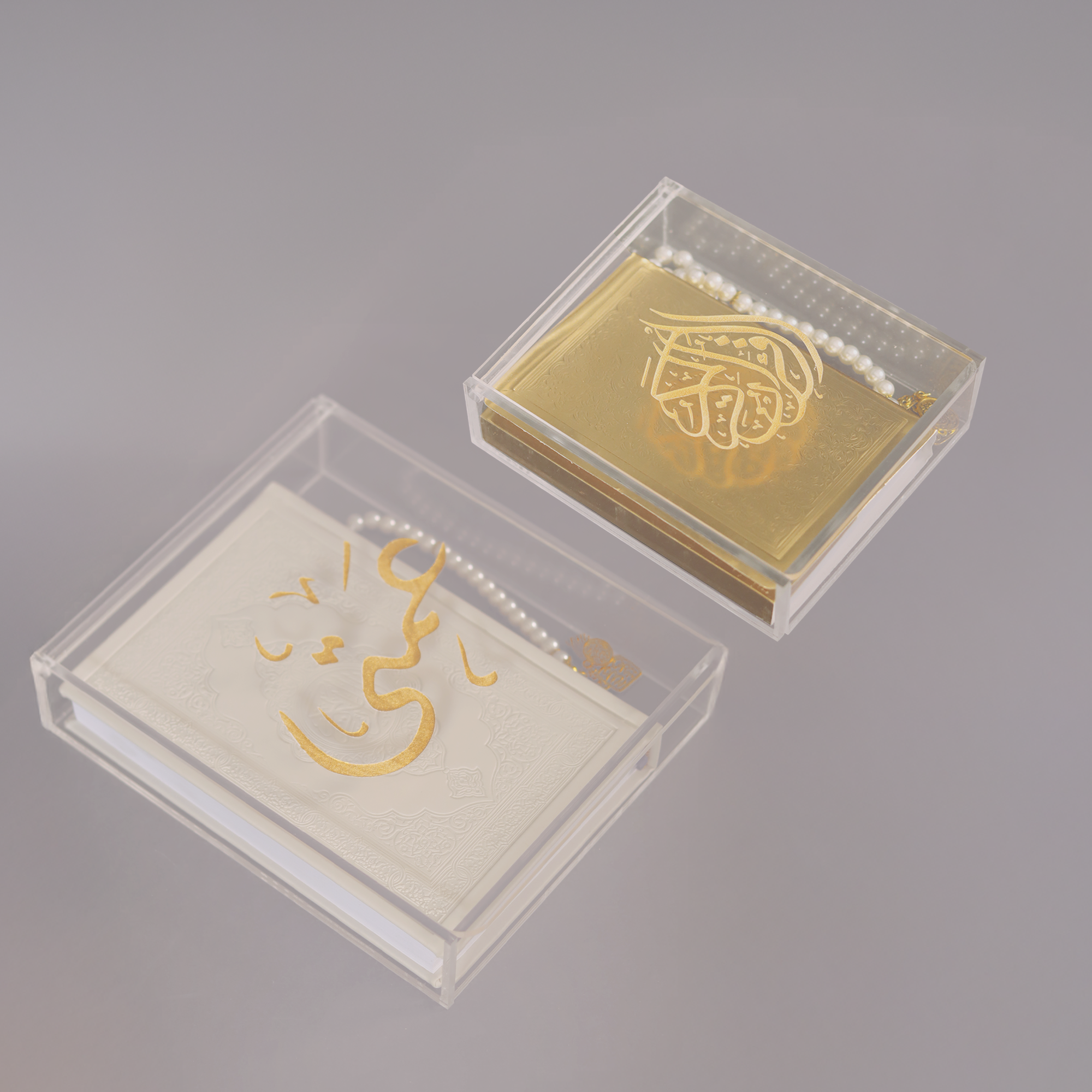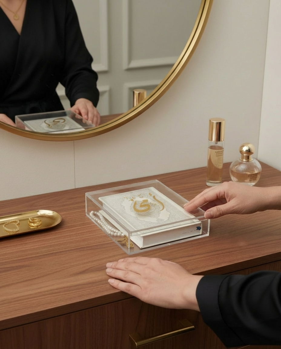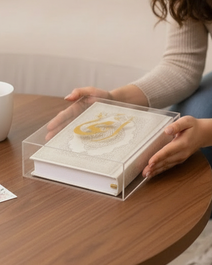 The Golden Qur’an Calligraphy Box is a refined blend of spirituality and modern luxury. Handcrafted from crystal-clear acrylic and crowned with a golden Arabic calligraphy engraving, this box elevates the timeless beauty of the Holy Qur’an. Available in small (12 × 15 × 4.5 cm) with a gold or silver mos7af and medium (22 × 27 × 5 cm) wit’s a white leather mos7af, it offers flexibility for both personal use and gifting.