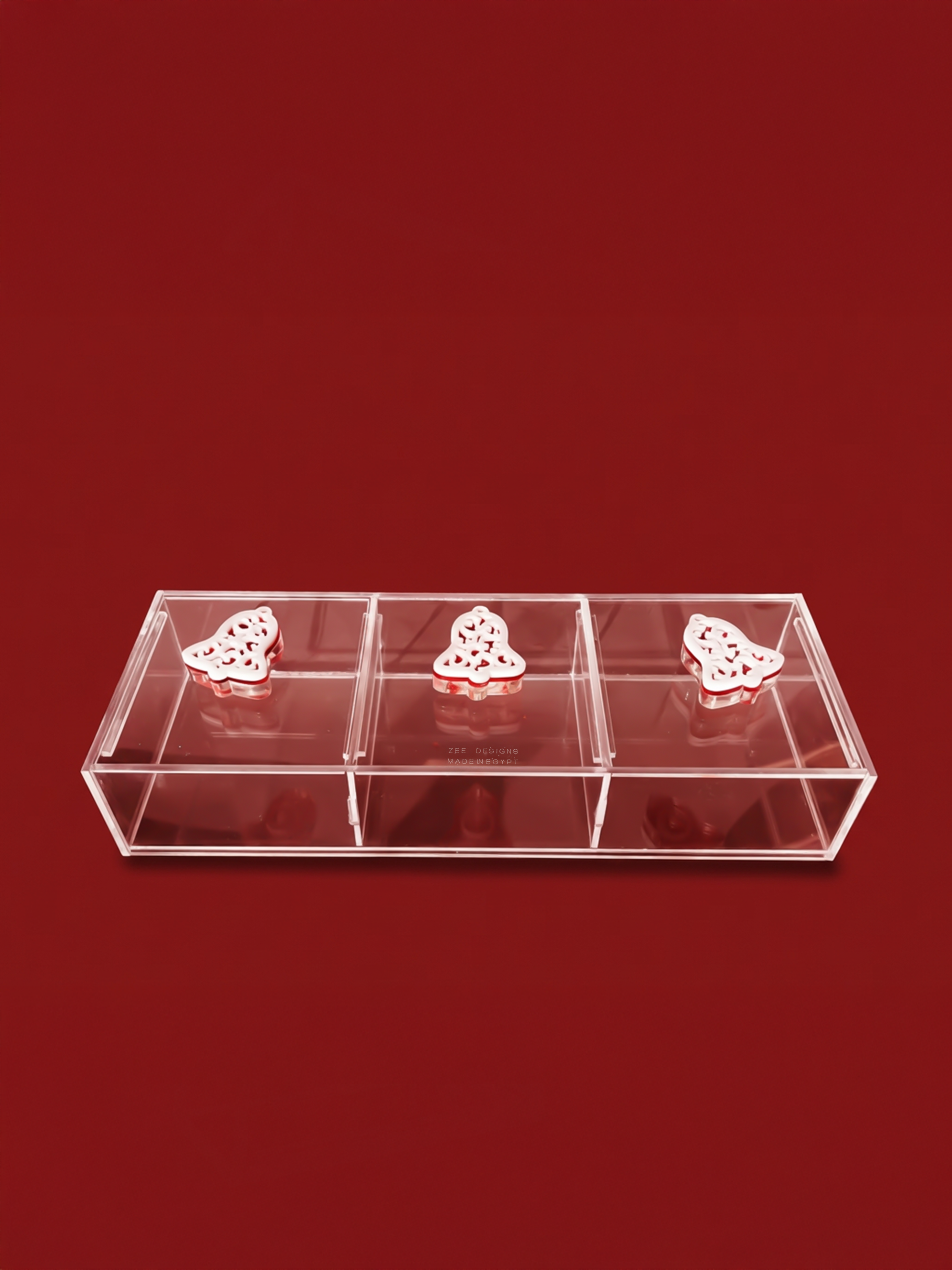 Celebrate the season with the Christmas Trio-Lid Rectangular Box by Zee Designs — a festive acrylic box designed with both charm and practicality in mind. Featuring three separate covers, each topped with a playful Santa hat knob, this piece allows for organized storage while adding joyful Christmas character to your space.