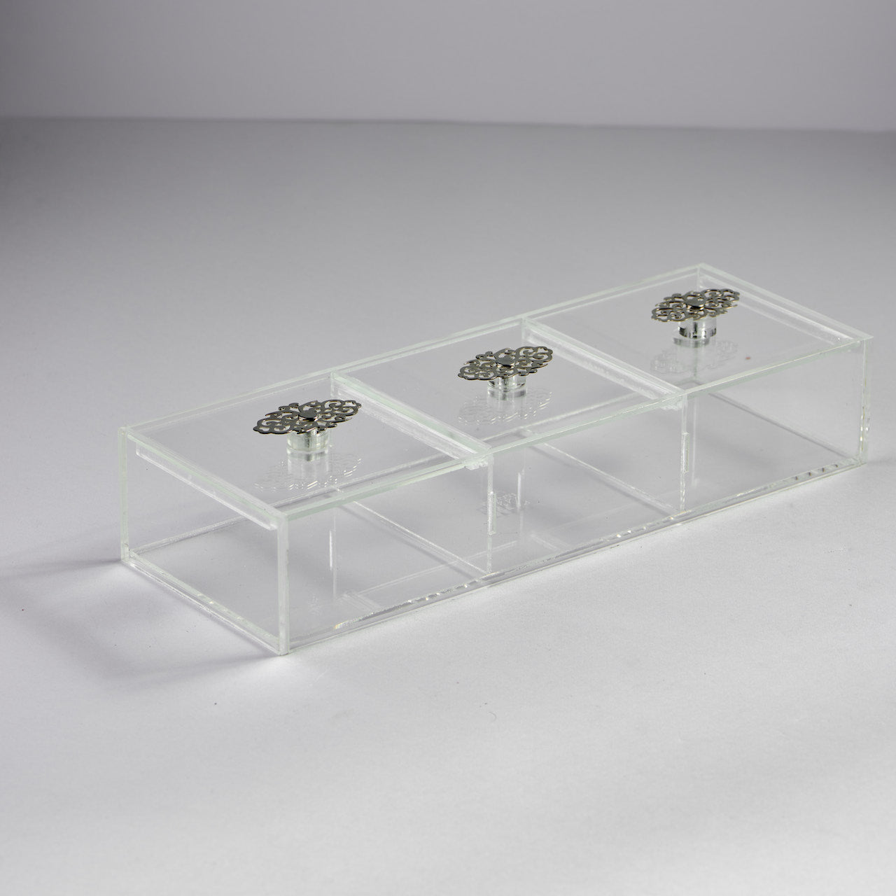 The Plated Large 3-Compartments Box – Silver by Zee Designs is an elegant serving and storage solution that blends high-shine glamor with everyday practicality. Designed with a clear plexiglass base and a silver-plated knob, this piece is available in two styles: one with a single unified cover, and another with three separate lids for flexible access. Its bold, reflective finish makes it a stunning addition to Ramadan tables, coffee corners, or event settings.