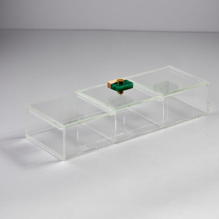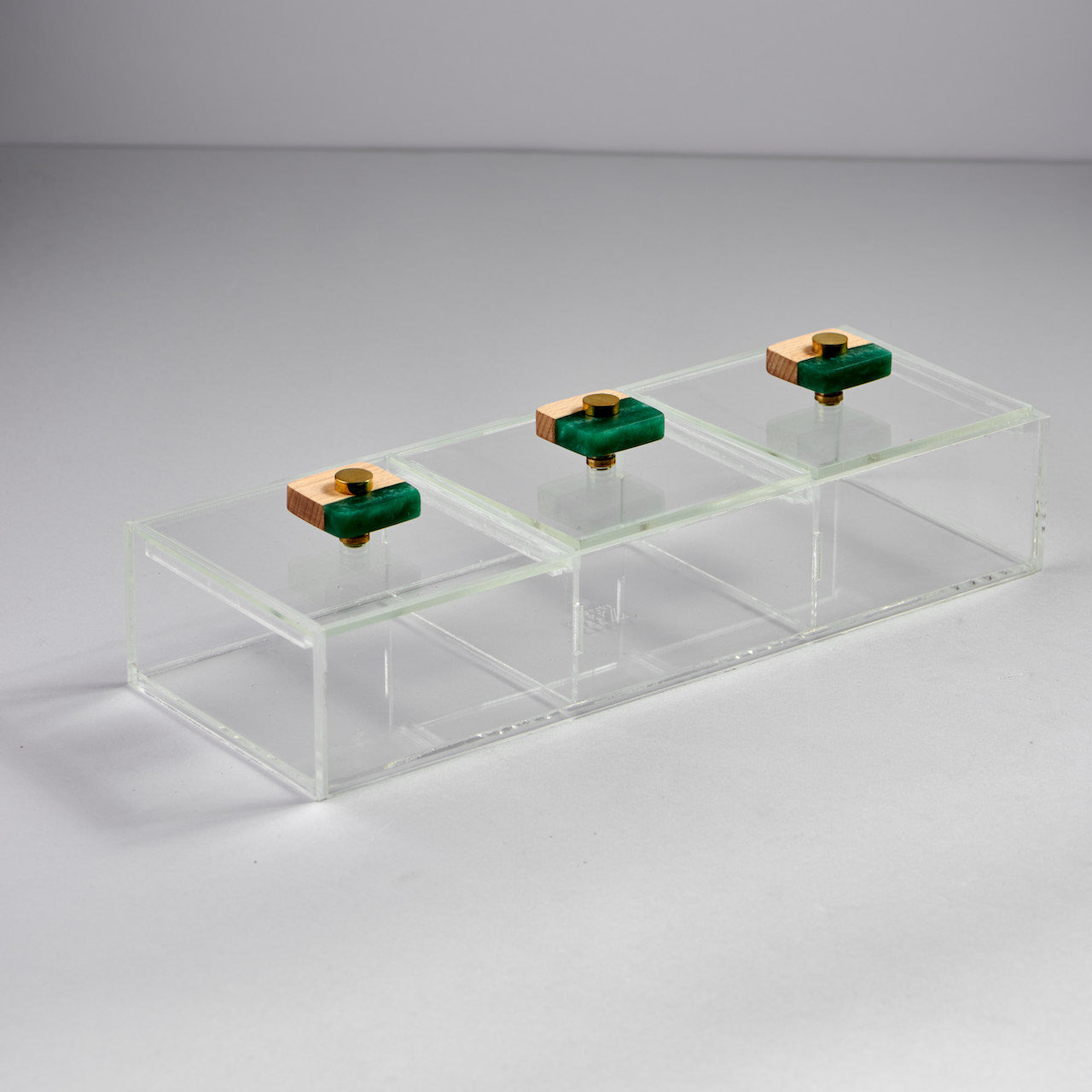 • The Resin Large 3-Compartments Box by Zee Designs is a sophisticated serving and storage solution that fuses natural textures with contemporary materials. Designed with a clear plexiglass base and topped with eye-catching resin knobs in Pearl & Wood or Emerald Green & Wood, this box brings a fresh organic touch to modern interiors. The large format includes three equal compartments that can be accessed via either a single unified lid or three separate covers, depending on your preferred functionality.