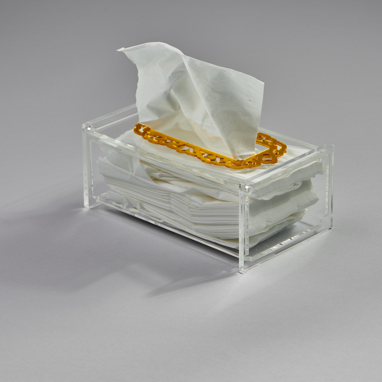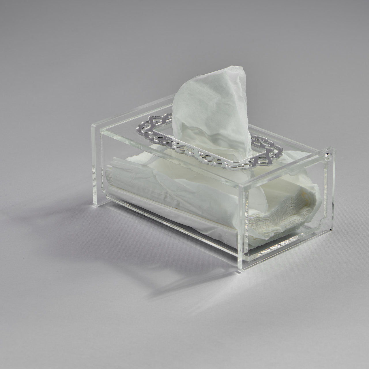 The Pivot Tissue Box by Zee Designs is a sleek, luxurious solution for everyday elegance. Made from durable clear plexiglass, this tissue box features a pivot-style lid for quick refills and effortless access. Measuring 22L x 13W x 9H cm, it’s designed to fit most standard tissue packs while maintaining a minimalist aesthetic that suits any room decor.