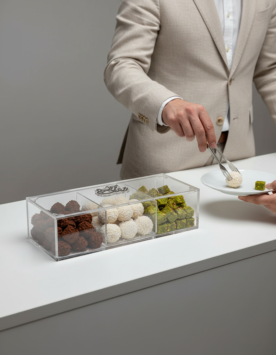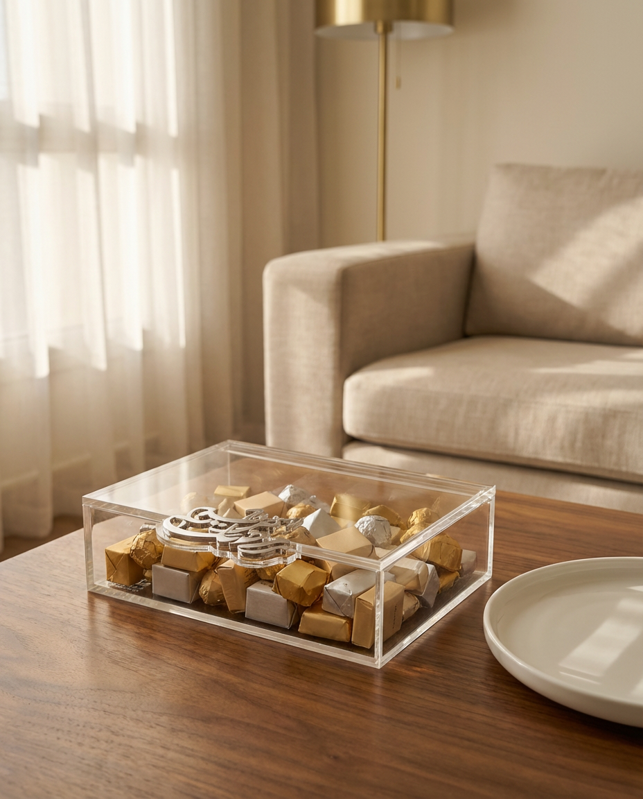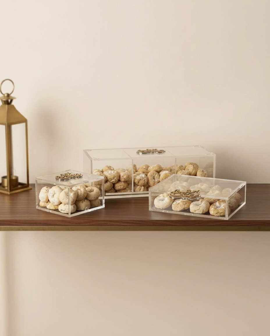 The Ramadan Kareem Boxes by Zee Designs are designed to bring elegance and spirituality to your Ramadan table. Crafted from clear plexiglass and adorned with a refined “Ramadan Kareem” inscription in either gold or silver, each box is a celebration of both form and meaning. Available in four shapes — Pivot Box, Cube Box, Sugar Container, and 3-Compartment Box — these pieces are perfect for hosting, gifting, and elevating your iftar or suhoor presentation.