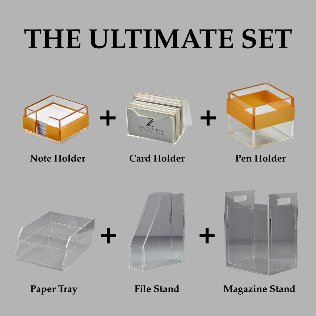 The Ultimate Set by Zee Designs is the all-in-one solution for anyone looking to create a functional, visually uncluttered workspace. Crafted from durable clear plexiglass, this 6-piece organiser kit offers dedicated space for every essential: